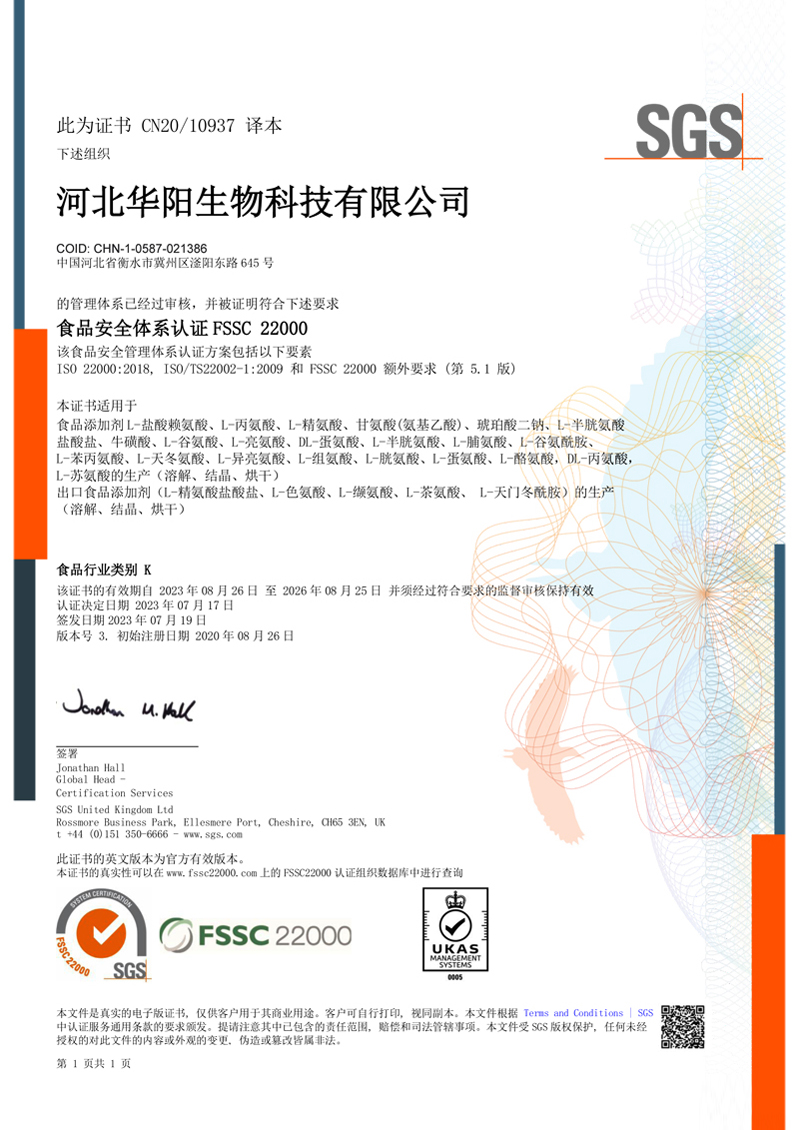 河北華陽集團坐落于河北省衡水市冀州區(qū)省級工業(yè)園區(qū)(始建于1987年,前身為冀州市華陽化工有限責任公司)。集團下屬四個公司:河北華陽生物科技有限公司、河北華悅氨基酸科技有限公司、滄州華晨生物科技有限公司、衡水市陽力商貿(mào)有限公司。主要生產(chǎn)甘氨酸、L-丙氨酸、L-蘇氨酸、DL-蛋氨酸、L-賴氨酸鹽酸鹽、L-半胱氨酸鹽酸鹽、干貝素等氨基酸系列食品級產(chǎn)品,廣泛應(yīng)用于食品、飲料、飼料等行業(yè)。......